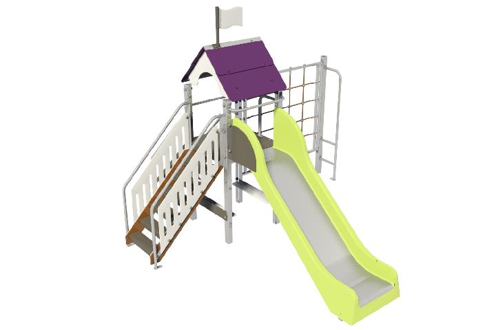 Panneaux décors, toits et rambardes en HPL Poteaux bois d'origine en pin autoclave classe 4 lasuré section 70 x 70 mm En option : poteaux en acier galvanisé garantie 10 ans sans entretien (peinture en option) Fixations au sol fournies Coloris : gris/prune ou orange/bleu Sol amortissant à prévoir