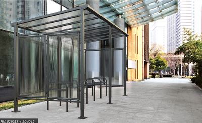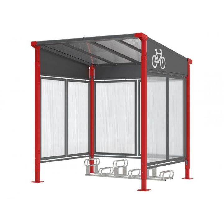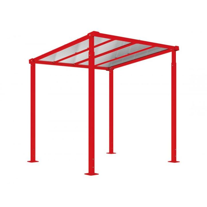 Longueur 2500 mm Structure : poteaux en acier 80 x 80 mm Toiture : traverses en tubes acier 60 x 60 mm, panneaux en polycarbonate alvéolaire épaisseur 10 mm traité anti-UV Extension possible par module de 2500 mm Finition peint sur galva en monochrome ou bicolore. Pose sur platines Bardages de fond et latéraux, coupe vent de toiture, support et appuis cycles en option.