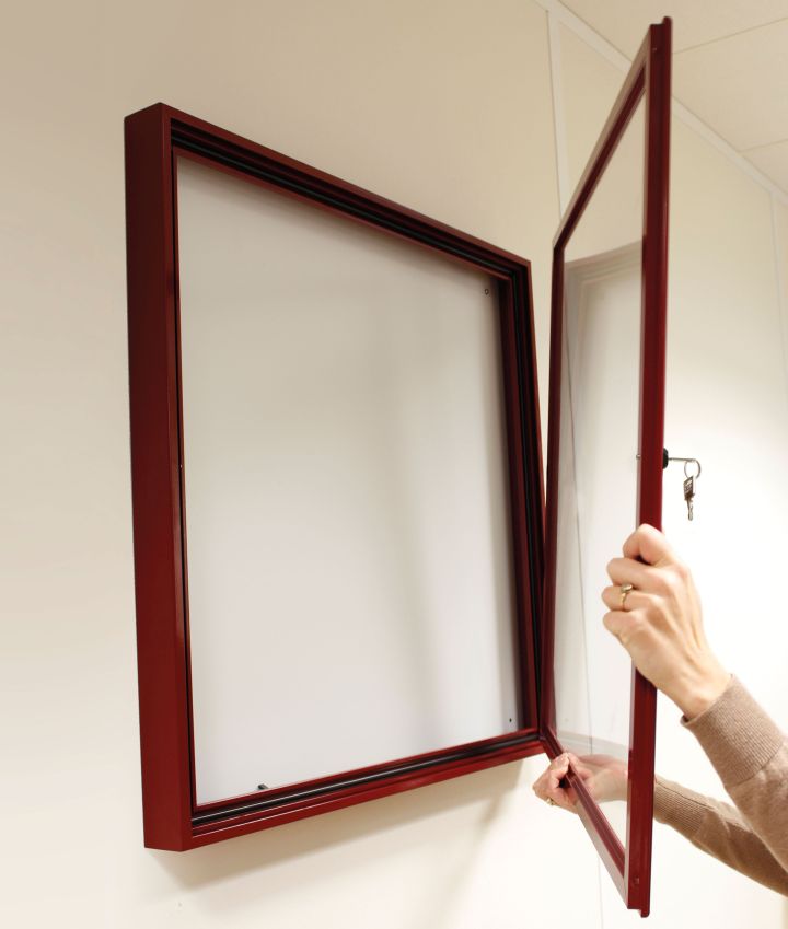 Vitrine extérieure simple face avec porte battante réversible. Cadre aluminium épaisseur 30 mm anodisé argent. Joint d’étanchéité élastomère. Vitrage Plexichocs épaisseur 4 mm. Serrure de sécurité avec deux clés. Fond en tôle galvanisée laquée blanc. Dos peint gris clair RAL 9002. Deux aimants fournis. Fixation murale. Dimensions : H 400 x L 550 mm (extérieures) H 303 X L 453 mm (surface d'affichage visible) soit 2 A4. Autres dimensions : nous consulter. OPTIONS (nous consulter) : kit éclairage LED, poteaux 60 x 40 mm, aimants supplémentaires, bandeau signalétique, en finition peinture.