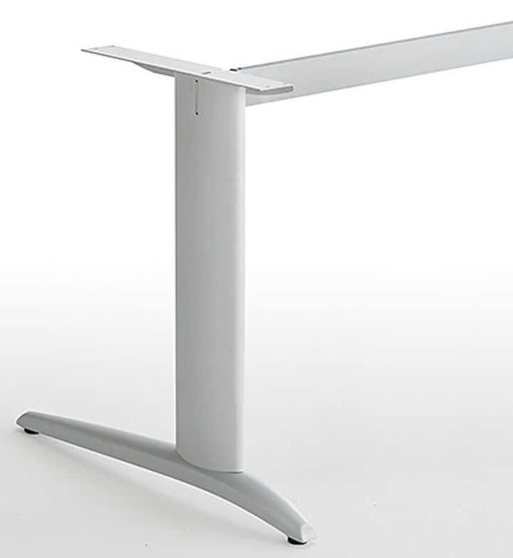 Piétement métallique à dégagement latéral avec passage de câbles vertical relié par une poutre de renfort .