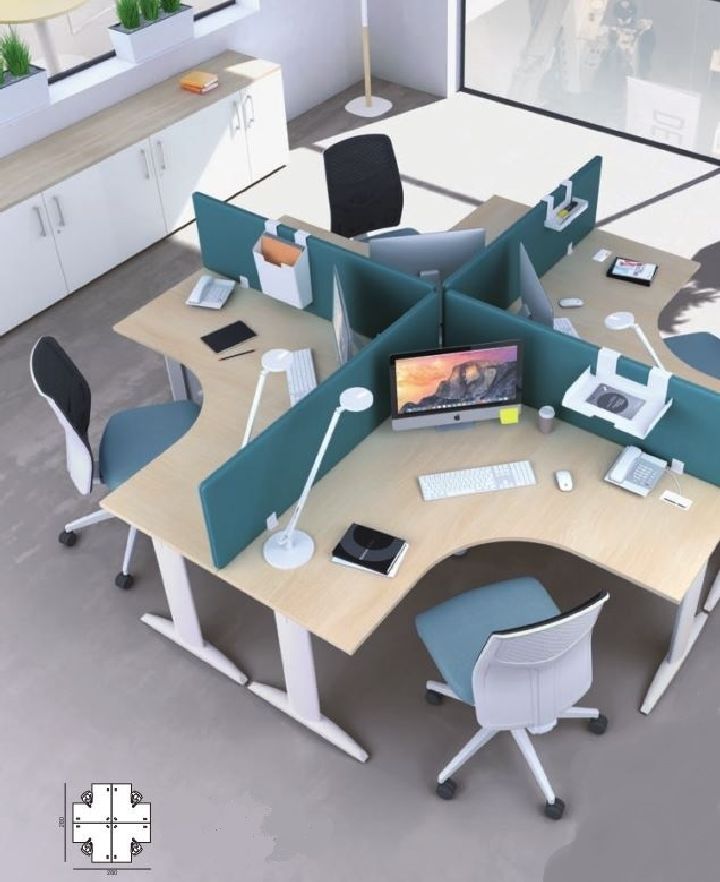 Bureau compact 90° symétrique à structure droite ou gauche. Plan stratifié épaisseur 25 mm avec chant droit ABS 2 mm coordonné. Obturateurs pour le passage des câbles. Piétement métallique à dégagement latéral avec passage de câbles vertical relié par une poutre de renfort et piétement de renfort . Vérins de mise à niveau. Option : goulotte d'électrification horizontale et piétement réglable en hauteur. dimension : retours 800 mm hauteur plan de travail 730 mm