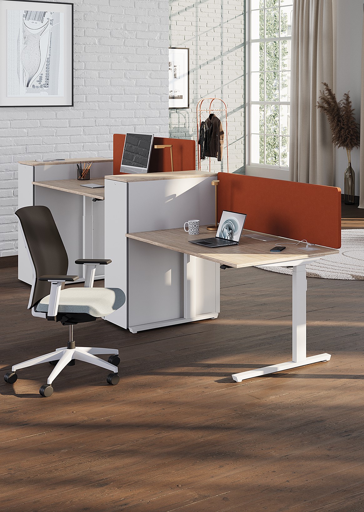Bureau rectangulaire Plateaux mélaminé épaisseur 22 mm comprenant 2 obturateurs Angles droits chant PVC Structure métallique comprenant voile de fond métallique raidisseur Piétement à dégagement latéral avec vérins de mise à niveau et passage des câbles verticalement Dimensions : 1800 x 800 mm - hauteur plan de travail : 730 mm Options : goulotte électrification horizontale - boitier prise intégré - écrans de séparation - caisson et desserte - classeur à ouverture latérale