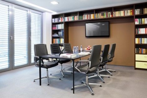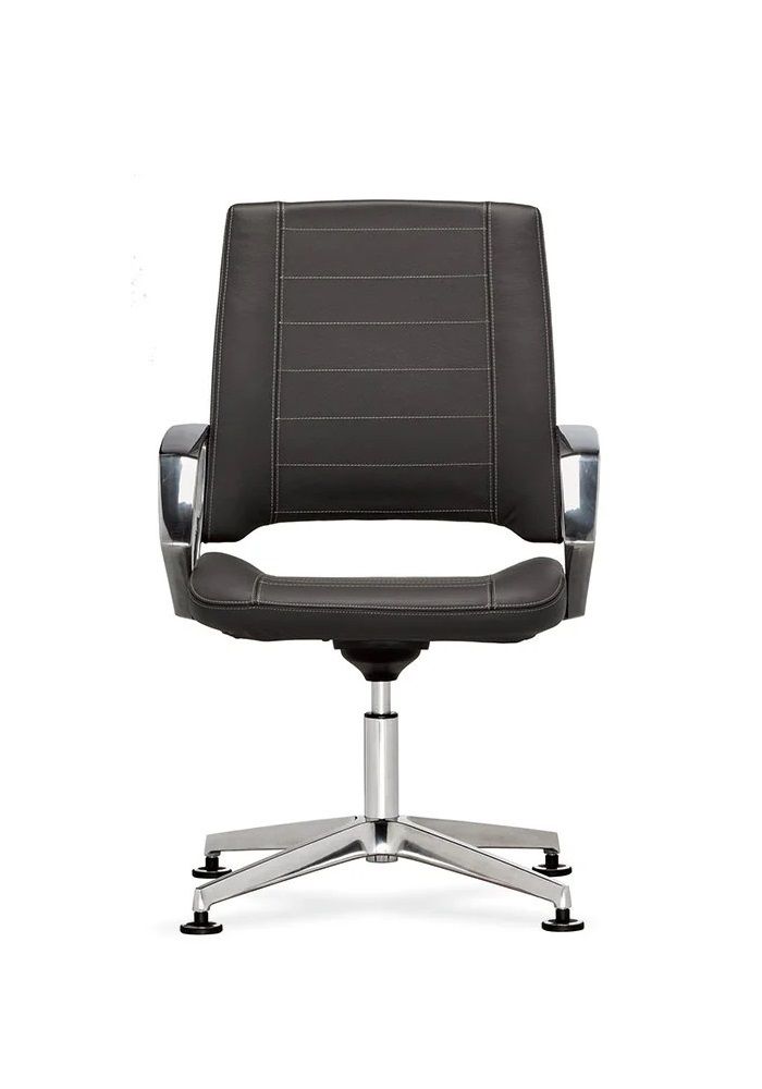 Fauteuil visiteur. Dossier et assise rembourrés en mousse polyuréthane recouvert tissu B. Mécanisme de rotation avec retour point fixe sans réglage de la hauteur. Structure métallique avec accoudoirs aluminium poli et piétement 4 branches en aluminium poli. Patins de protection des sols. Dimension : dossier largeur 520 x hauteur 590 mm - assise largeur 640 mm. Conforme aux normes Européennes EN 1335 1/2/3. Option : réalisable en cuir.