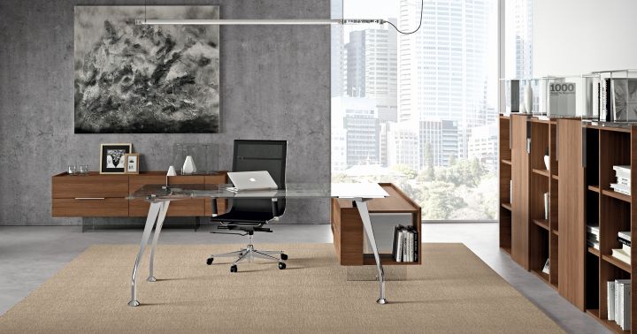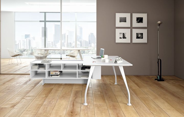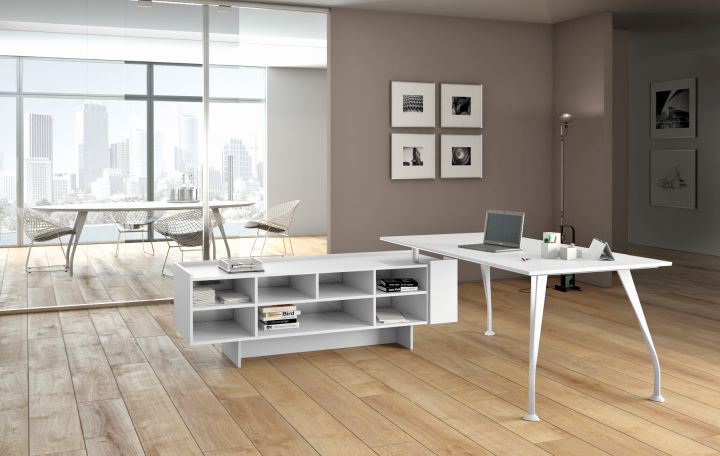 Bureau directionnel . Plan de travail rectangulaire bois ou verre Pieds chrom?s brillant ou blanc Dimension bureau verre : 1800 x 1000 mm - Hauteur plan de travail 730 mm. Dimension bureau bois : 1800 x 900 mm - Hauteur plan de travail 740 mm - Les plateaux en m?lamine sont de 12 mm additionn? ? un plateau MDF de 23 mm. Total 35 mm. 3 coloris m?lamin?. Compositions et ?quipements aux choix. Options non comprises : meuble de service - rallonge - module ? tiroirs - ?lectrification.