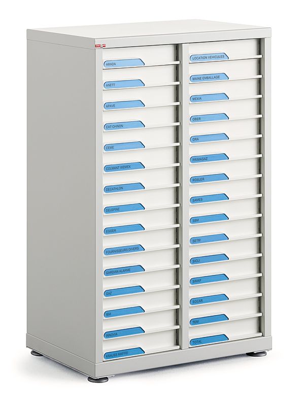 Corps de meuble en acier peint ?poxy (6 coloris) 30 tiroirs e-clen H6 cm en plastique antichoc (5 coloris) Prot?ge-?tiquette en plastique pour tiroirs (8 coloris) Options sur demande : serrure - top m?lamin? ?paisseur 22 mm angles vifs (18 coloris)
