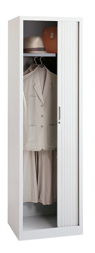 Armoire de rangement métallique monobloc avec revêtement poudre époxy. Fermeture par rideau PVC non feu M1 avec lame terminale acier et serrure à clés. Equipée de 4 tablettes métalliques réglables pouvant recevoir des dossiers suspendus. Rail dossier suspendu en partie haute. Soit 5 rangées de dossiers suspendus Socle sur vérins de mise à niveau.