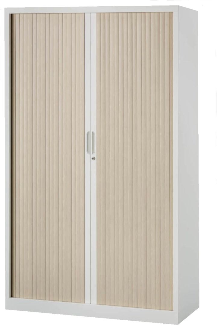 Armoire penderie métallique monobloc avec revêtement poudre époxy. Fermeture par rideau PVC non feu M1 avec lame terminale acier et serrure à clés. Equipée d'une tablette penderie et de 4 demi tablettes métalliques réglables pouvant recevoir des dossiers suspendus. Rail dossier suspendu en partie haute. Socle sur vérins de mise à niveau.
