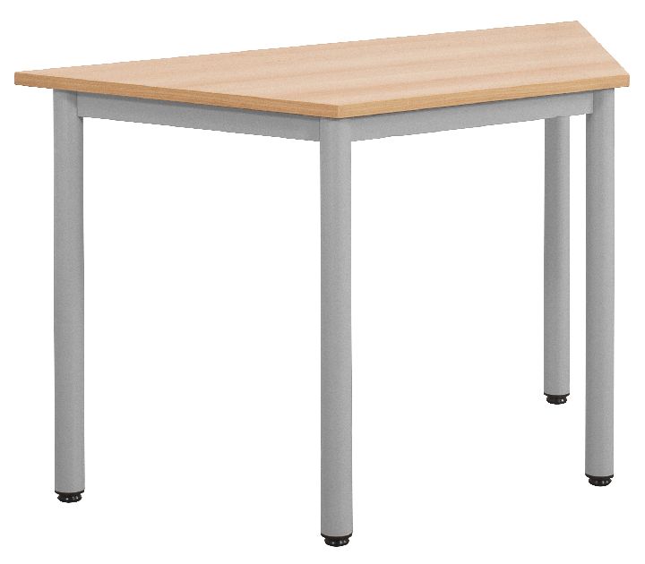 Table trapèze. Plan mélaminé épaisseur 19 mm avec chant PVC. Cadre métallique 50/20 mm sous plateau Piétement métallique à 4 pieds de section ronde 50 mm . Vérins de mise à niveau. Nombreux choix de coloris plateau et piétement. dimension : hauteur plan de travail 760 mm. Option : plateau stratifié et nombreuses dimensions