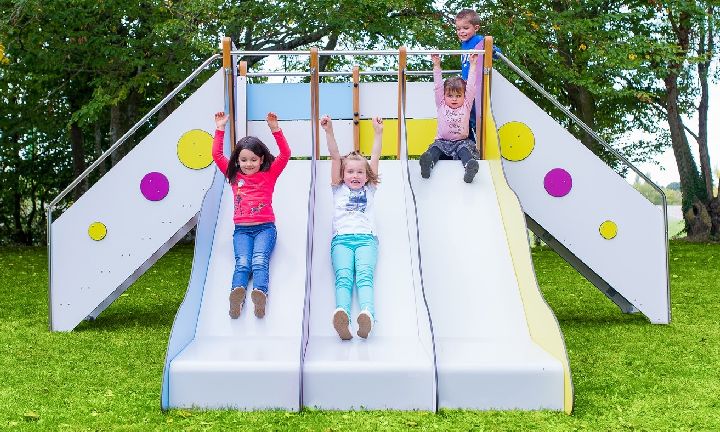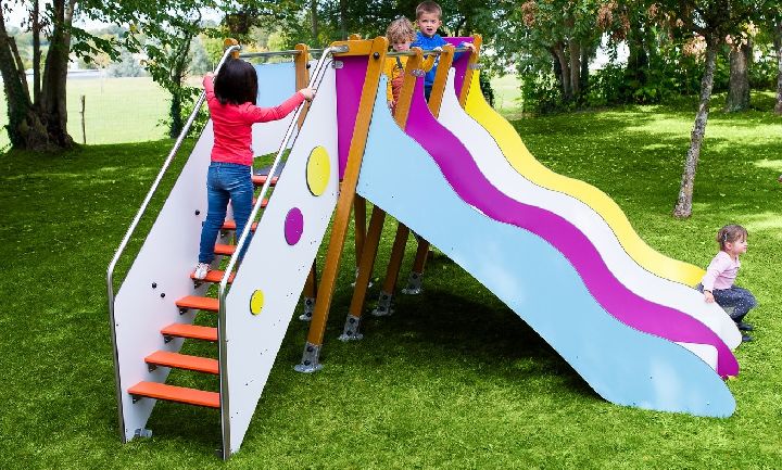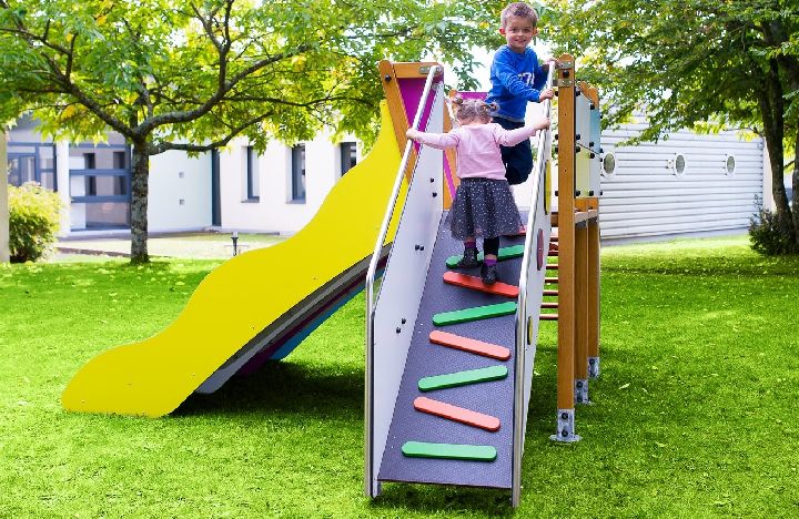 Poteaux et traverses en bois massif Panneaux en HPL Marches en panneau multiplis revêtu d'un film antidérapant Eléments métalliques en acier revêtus d'une laque Glissière en polyester avec possibilité de zone de glissement en inox Fixations courtes au sol en acier galvanisé Visserie inox et zinguée Options : rampe, fixations longues