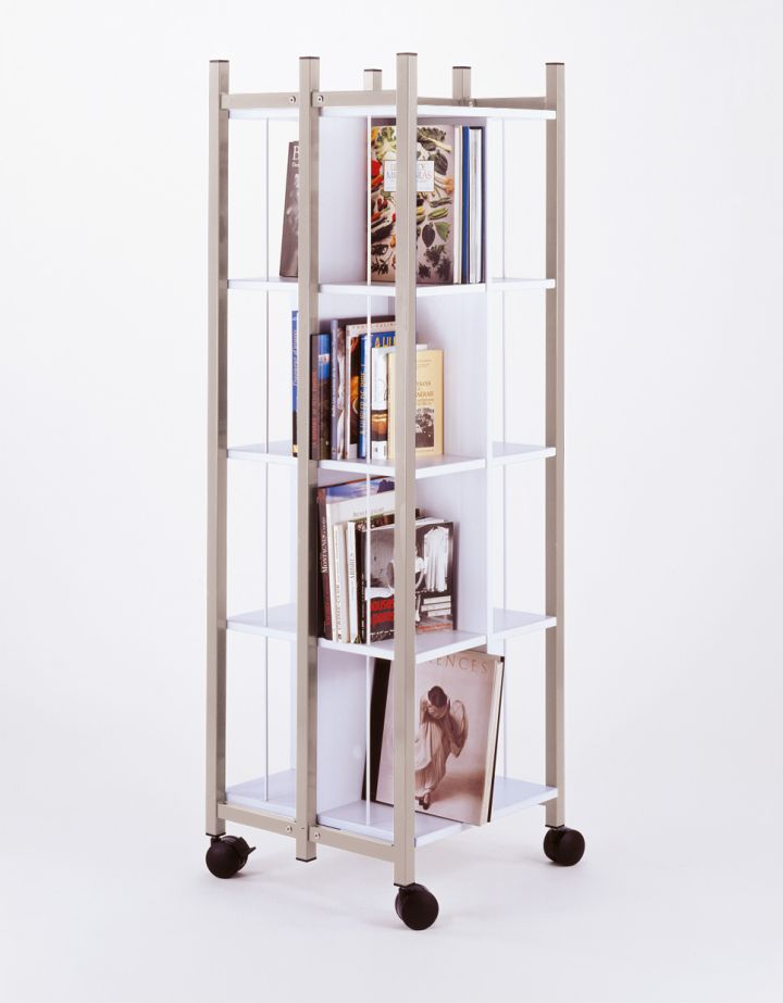 Tour à livres montée sur 4 roulettes pivotantes, dont deux avec freins. Cinq tablettes de 500 x 500 mm, dont une de couverture. 4 niveaux de 4 cases avec un arrêt de livres en fil d'acier rond sur les cotés extérieurs. Structure composée de deux échelles mécano soudées constituées chacune de deux montants en tube carré de 30x30 mm et entretoises aux extrémités par deux traverses en tube rectangle de 30x20 mm finition époxy. Les échelles sont reliées au niveau des traverses par deux longerons en tube rectangle de 30x20mm, équipés de pattes en tôle de 4mm d'épaisseur. Les panneaux sont en mélaminé de 19 mm d'épaisseur, et tous les chants visibles sont en ABS de 2 mm d'épaisseur. Dimensions : 530 x 530 x 1670.