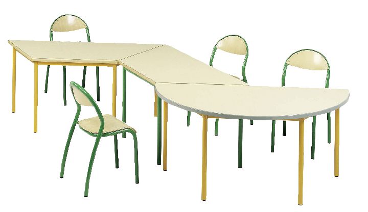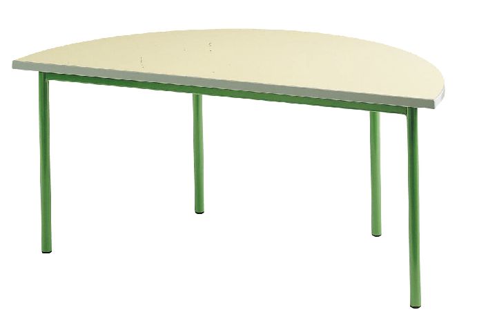 Table demi-lune à plateau stratifié épaisseur 24 mm avec alaise bois. Ossature métallique avec piétement de section ronde 50 mm équipé de vérins de mise à niveau. Option casier plastique sur certain modèle. Dimension respectant les normes européennes NF EN 1729 Sur demande plateau mélaminé à chant PVC ou stratifié à chant surmoulé.