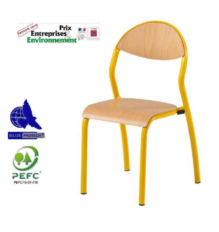 Chaise 4 pieds empilable par 4. Assise appliquée rivetée 8 mm avec cuvette / Dossier encastré riveté 7 mm. Assise et dossier en multiplis hêtre finition Blueprotech®. Ossature métallique en tube Ø 25 mm épaisseur 1,5 mm avec goussets de renfort aux soudures. Embouts non tachants et non marquants (polyéthylène). Origine des bois issue de forêts gérées durablement, certifiée PEFC.