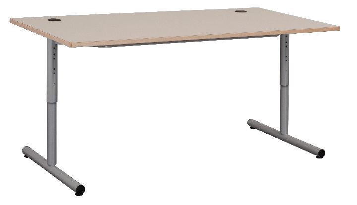 Plateau stratifié épaisseur 24 mm avec chant PVC et 2 passe-câbles. Cadre métallique soudé sous plateau avec piétement à dégagement latéral de section ronde 45 mm réglable en hauteur taille 3 à 6. Equipé de vérins de mise à niveau. Option kit liaison inter table. Sur demande disponible en plateau mélaminé à chant PVC