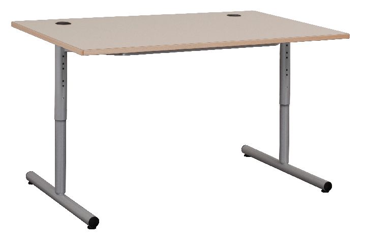 Plateau stratifié épaisseur 24 mm avec chant PVC et 2 passe-câbles. Cadre métallique soudé sous plateau avec piétement à dégagement latéral de section ronde 45 mm réglable en hauteur taille 3 à 6. Equipé de vérins de mise à niveau. Option kit liaison inter table. Sur demande disponible en plateau mélaminé à chant PVC