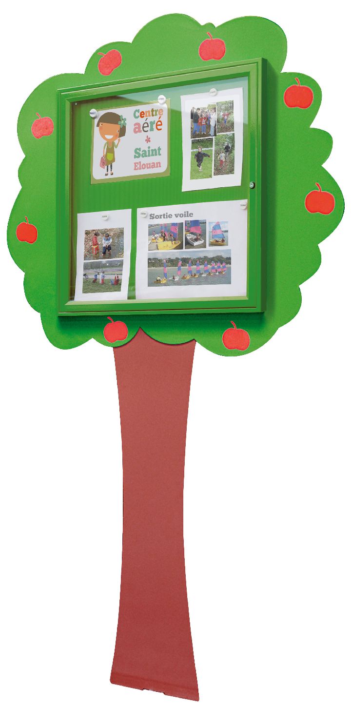 Décor arbre en compact 12 mm fixé sur un poteau bois 93 x 93 x hauteur 2000 mm avec platine en acier galvanisé. Hauteur 2160 x 1230 mm. Feuillage RAL 6018 et tronc RAL 8004.