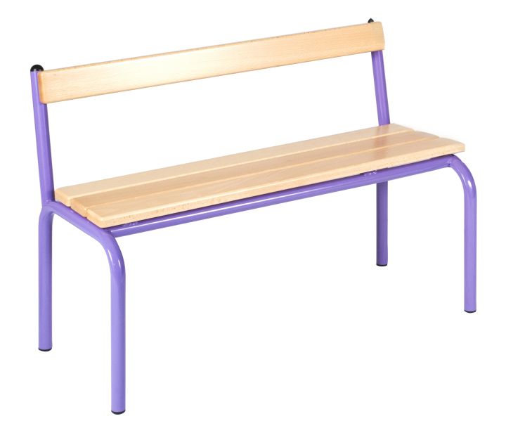 Lames en hêtre avec revêtement BLUEPROTECH fixées sur cadre métallique. Ossature métallique avec piétement 4 pieds de section ronde 25 mm. Empilable. longueur 1200 mm