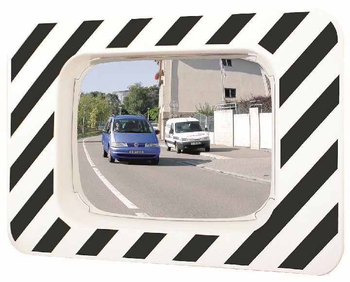 Distance maximum de l'utilisateur au miroir environ 15 mètres. Optique 800 x 600 mm - cadre 1200 x 900 mm rayé blanc et noir. Contrôle 2 directions pour une vision à 90° environ. Résistance au vent jusqu'à 183 km/h. Qualité Polymir 3 ans de garantie (incassable, indéformable, anti-UV). Fixation universelle comprise pour murs et poteaux ronds (Ø60 à 90mm) ou rectangulaires (60x80 ou 80x80mm). Conforme à l'article 14 de l'Instruction interministérielle sur la signalisation routière.