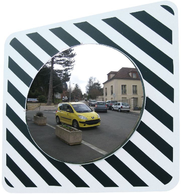 Distance maximum de l'utilisateur au miroir environ 10 mètres. Optique Ø 600 mm - cadre 930 x 930 mm rayé blanc et noir. Contrôle 2 directions pour une vision à 90° environ. Résistance au vent jusqu'à 183 km/h. Qualité Inox 7 ans de garantie (incassable, inoxydable, insensible aux UV, grande longévité). Fixation universelle comprise pour murs et poteaux ronds (Ø76 à 90mm) ou rectangulaires (60x80 ou 80x80mm). A installer sur poteau en acier exclusivement (non fourni). Conforme à l'article 14 de l'Instruction interministérielle sur la signalisation routière.