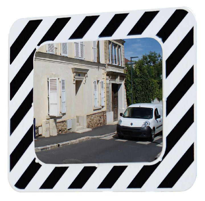 Distance maximum de l'utilisateur au miroir environ 15 mètres. Optique 800 x 600 mm - cadre 1200 x 910 mm rayé blanc et noir. Contrôle 2 directions pour une vision à 90° environ. Résistance au vent jusqu'à 183 km/h. Qualité Inox 7 ans de garantie (incassable, inoxydable, insensible aux UV, grande longévité). Fixation universelle comprise pour murs et poteaux ronds (Ø76 à 90mm) ou rectangulaires (60x80 ou 80x80mm). A installer sur poteau en acier exclusivement (non fourni). Conforme à l'article 14 de l'Instruction interministérielle sur la signalisation routière.