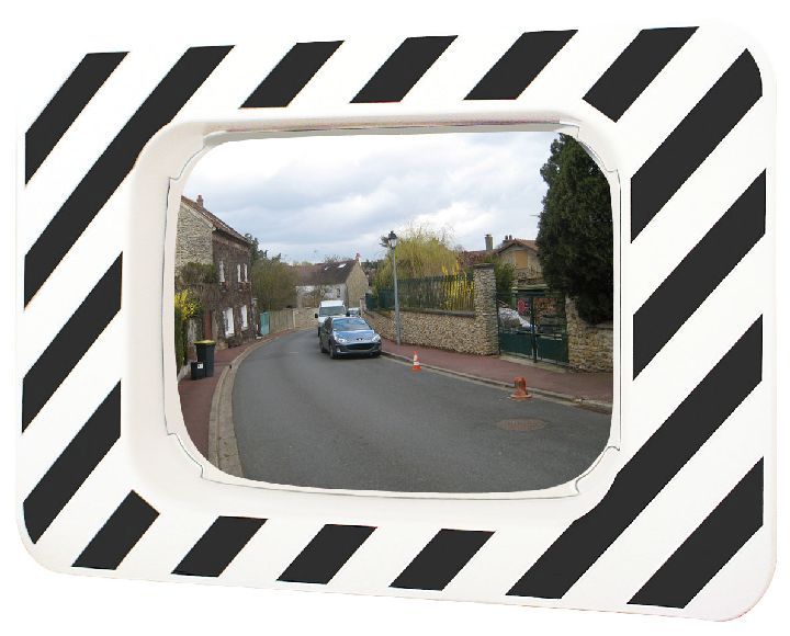 Distance maximum de l'utilisateur au miroir environ 8 mètres. Optique 600 x 400 mm - cadre 900 x 600 mm rayé blanc et noir. Contrôle 2 directions pour une vision à 90° environ. Résistance au vent jusqu'à 183 km/h. Qualité P.A.S. 5 ans de garantie (incassable, indéformable, anti-UV, anti-rayures, antistatique). Fixation universelle comprise pour murs et poteaux ronds (Ø60 à 90mm) ou rectangulaires (60x80 ou 80x80mm). Conforme à l'article 14 de l'Instruction interministérielle sur la signalisation routière.